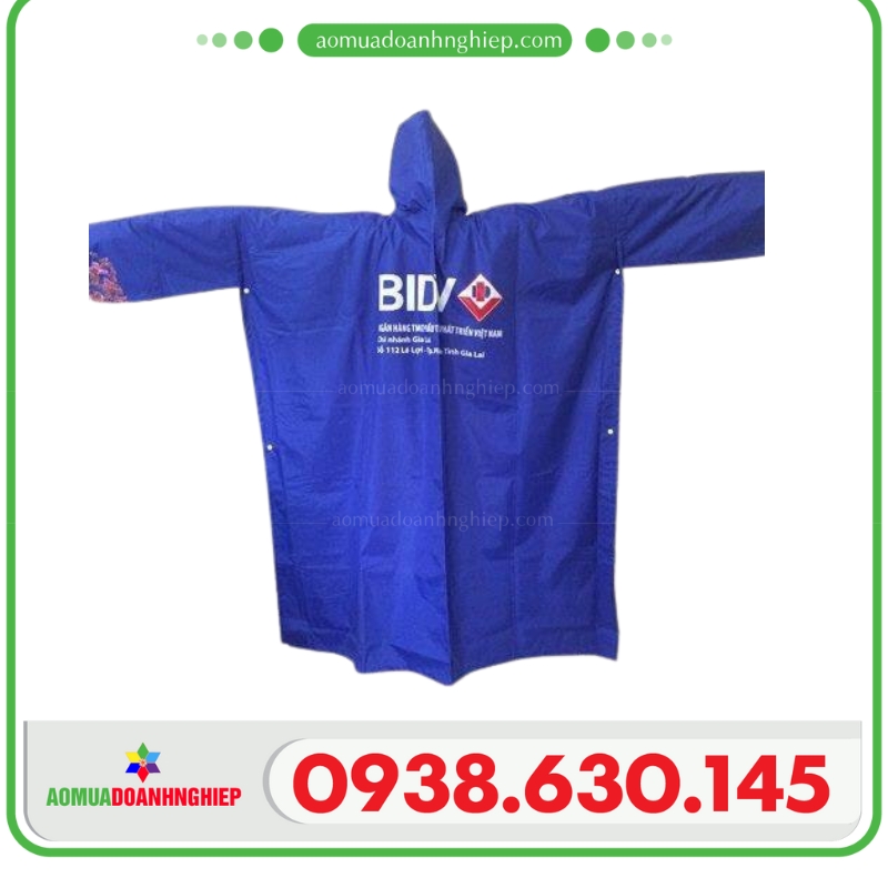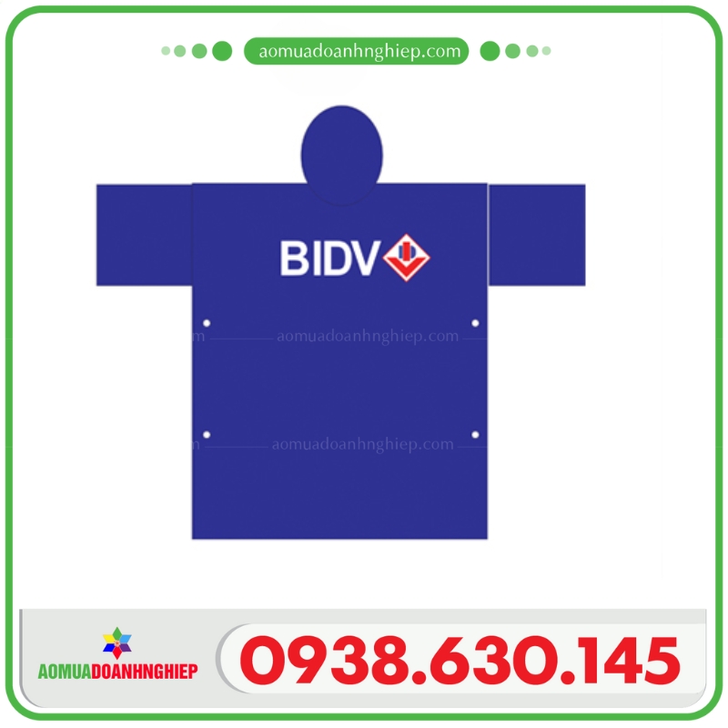 Áo mưa cánh dơi ngân hàng BIDV được thiết kế hiện đại, che phủ rộng và chống thấm hiệu quả, giúp người dùng an toàn và thoải mái khi di chuyển dưới mưa. Sản phẩm được làm từ vải dù cao cấp hoặc PVC bền đẹp, gọn nhẹ và dễ sử dụng hằng ngày. Logo BIDV được in sắc nét, bền màu, tạo dấu ấn thương hiệu chuyên nghiệp trong mắt khách hàng. Ngoài các mẫu sẵn có, doanh nghiệp có thể đặt may áo mưa theo yêu cầu, đảm bảo phù hợp với từng chiến dịch quảng bá và nhận diện thương hiệu đồng bộ.